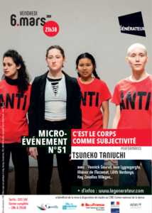 Comme pour le « Micro-événement n°50 /Mon corps est politique », présenté au Générateur en 2019, Tsuneko Taniuchi convoque à nouveau le corps des participants et en fait un lieu de résistance et de combat : le corps comme subjectivité.