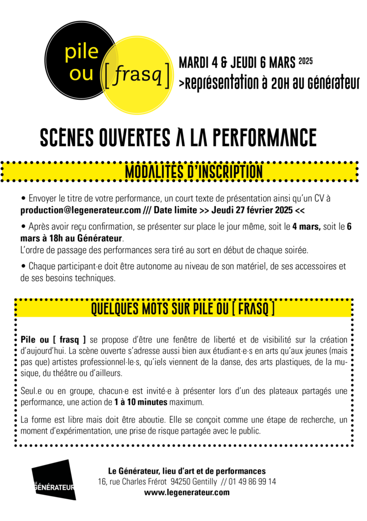 Pile ou [ frasq ] est une scène dédiée à la présentation d’actions et de gestes performatifs inattendus dans sa définition la plus large possible. Pour cette 15ème édition, qui se déroule le temps de deux soirées, c’est la promesse renouvelée de paris artistiques stimulants et de surprenantes découvertes.