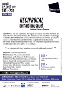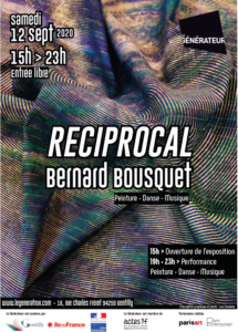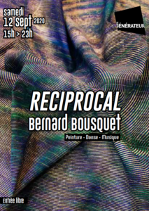 RECIPROCAL est une expérience du regard qui déjoue les codes habituels de l’exposition en utilisant des formats, des matériaux et des modalités d’accrochage inattendus. Bernard Bousquet peint sur d’immenses rouleaux de tissus qu’il déploie du sol au plafond comme autant de mondes peuplés de formes et couleurs. Ses peintures faites de chaos de traits, points, formes cultivent ici encore plus l’indétermination jusqu’à parfois l’évanescence, grâce à un procédé sérigraphique de surimpressions multiples dans lequel il n’hésite pas à multiplier les aléas techniques de façon maîtrisée mais pas toujours ! Rien dans son installation plastique multidimensionnelle de taille XXL n’y est objectivement reconnaissable alors que tout y semble familier.