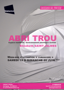Élizabeth Saint-Jalmes presents ABRI TROU, a giant immersive inflatable space she has imagined as a theater of games and possibilities. Over the course of a weekend, she presents a “Curoscope” performance installation, conceived as a total precarious work of art, bringing into play ways of approaching doing and doing together in dialogue with other living beings.
