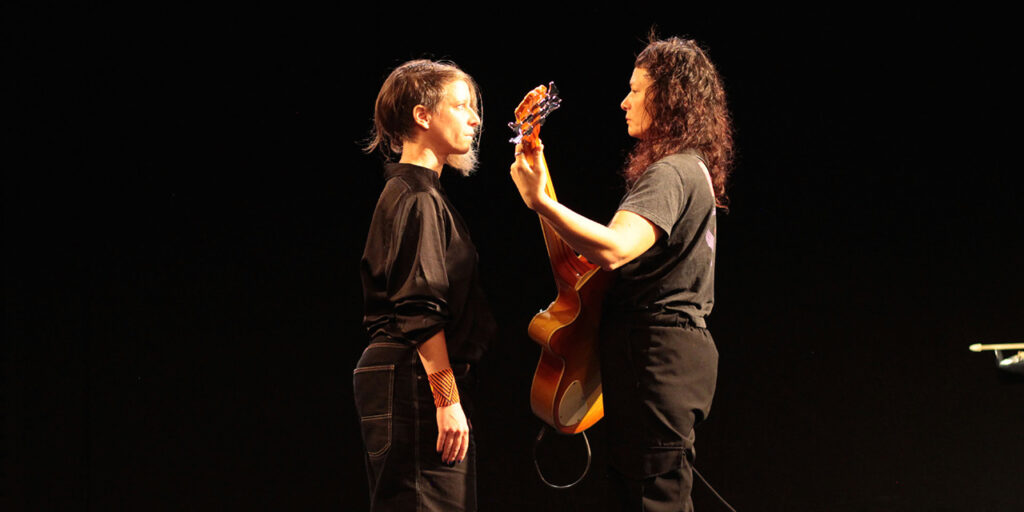 Etudes pour Chevalières fait partie d’un diptyque de deux pièces plateau autonomes : le duo danse et musique – création 2026 et sa démultiplication pour cinq danseuses interprètes – création 2027.