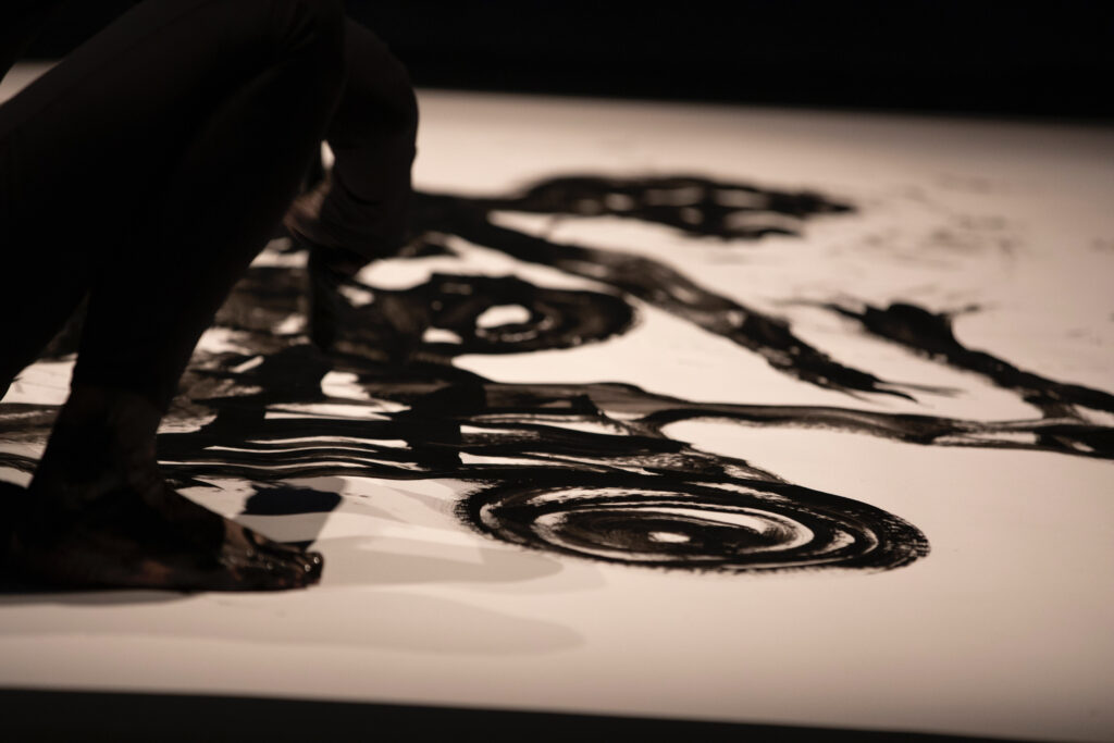 L’artiste va ici jusqu’au bout de son geste pictural, quitte à se fondre dans son oeuvre, dans un mouvement de transformation perpétuelle.