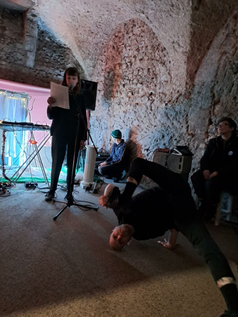 Aluminum Knowledge is a performance that unfolds in a universe where my body interacts with performative elements that aim to bring out a triangular tension between a dark imagination, a luminous imagination, and an attitude that is both feminist and festive. Under the guise of a festive spirit, which conceals a certain exuberance, this performance-chronicle attempts to create a dialogue between the concepts of the body and urbanity with angular, luminous, or metallic structures, fragments of an imaginary city.