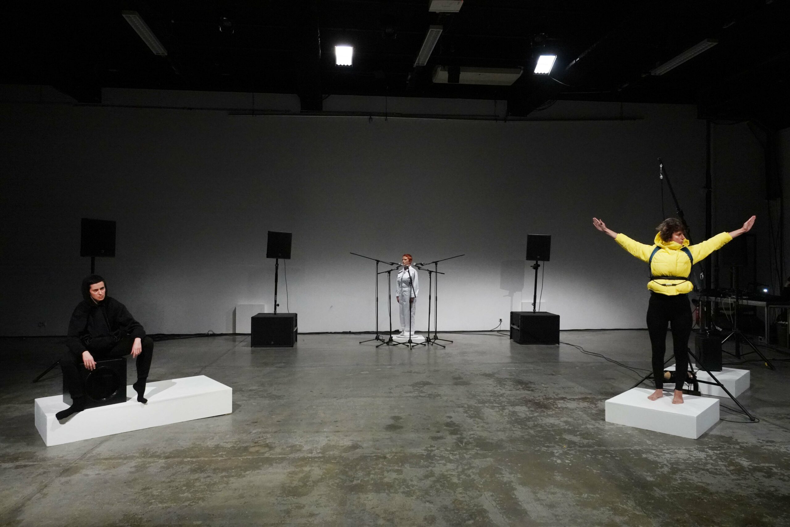 Camille Lacroix présente une galerie de ready-made vivants et haut-parlants à basse performance énergétique. En élargissant la problématique du gaspillage énergétique au corps humain, cette performance sonore interroge avec humour nos fantasmes de haute performance et d’intensité perpétuelle. Ainsi les corps des trois performeuses sont couplés à des dispositifs sonores qui recyclent leurs «énergies gaspillées».